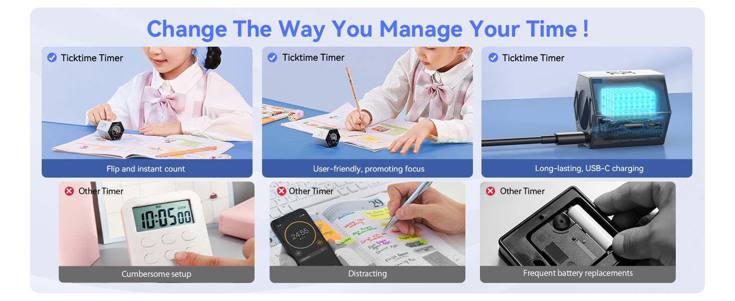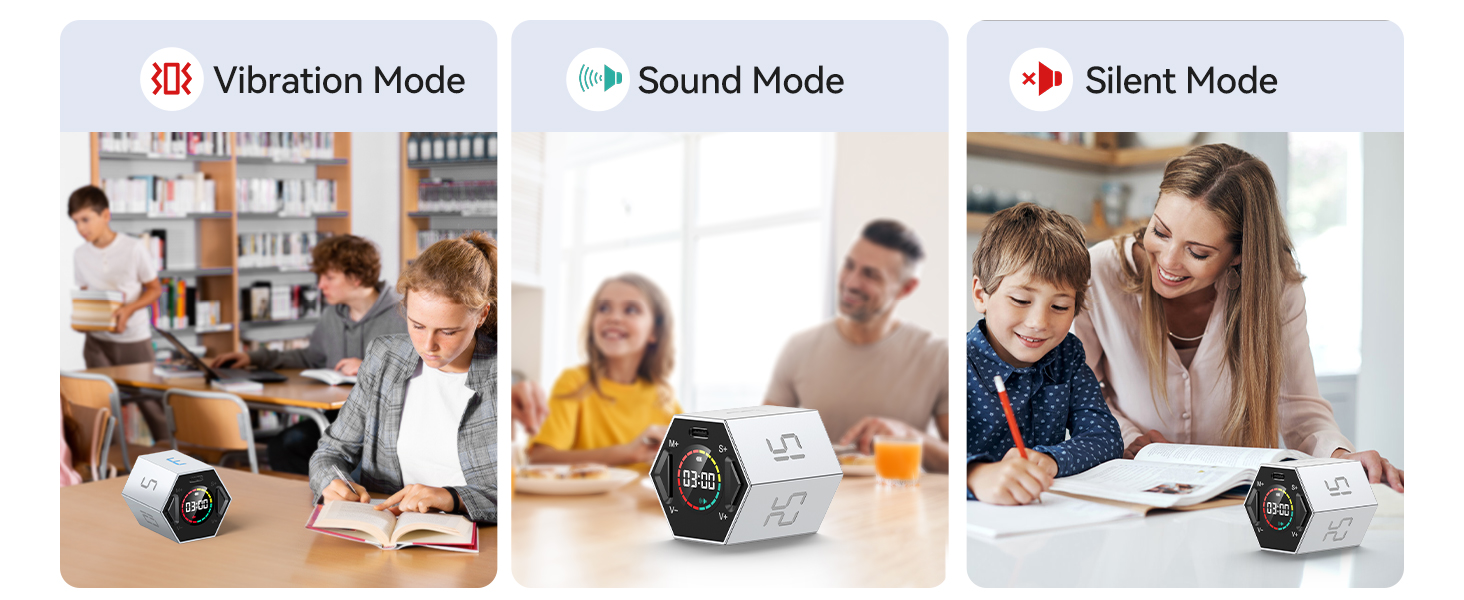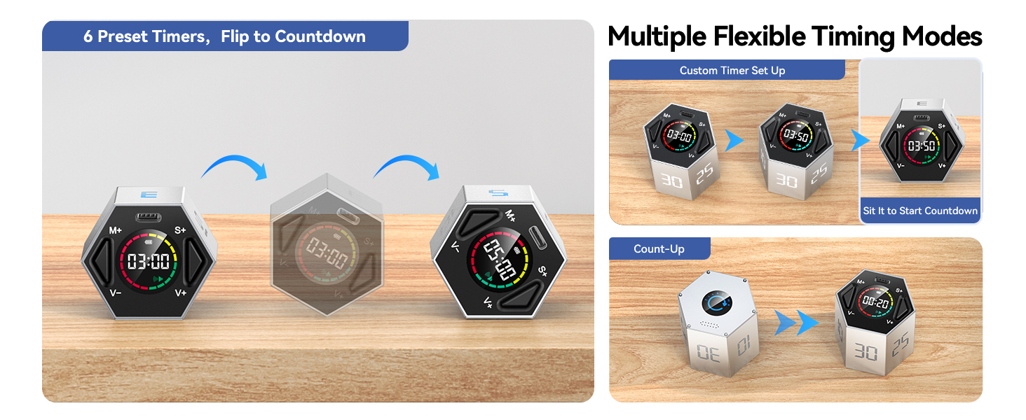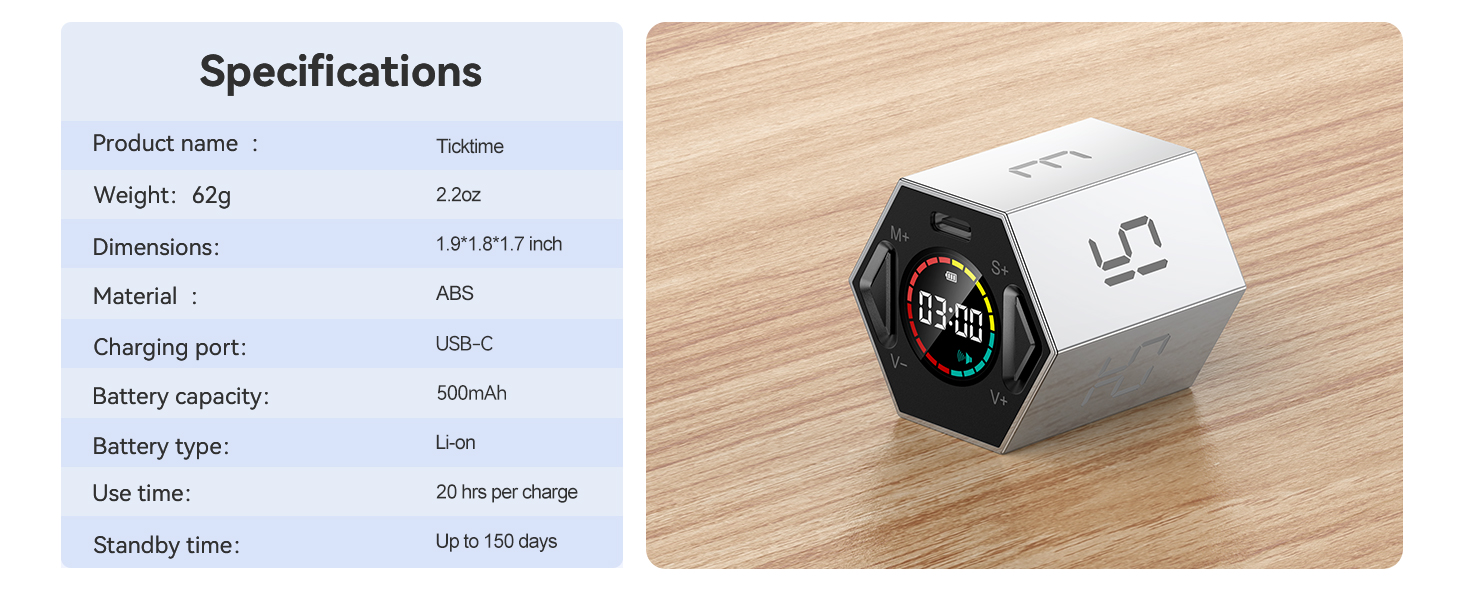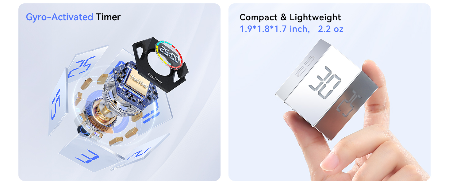 Ticktime Pomodoro Timer, Productivity Timer Cube, 3/5/10/15/25/30 Min Presets, Custom Countdown & Stopwatch 1s–99m59s, Sound/Vibration/Silent, Magnetic, Rechargeable, for ADHD Study Work, Gray